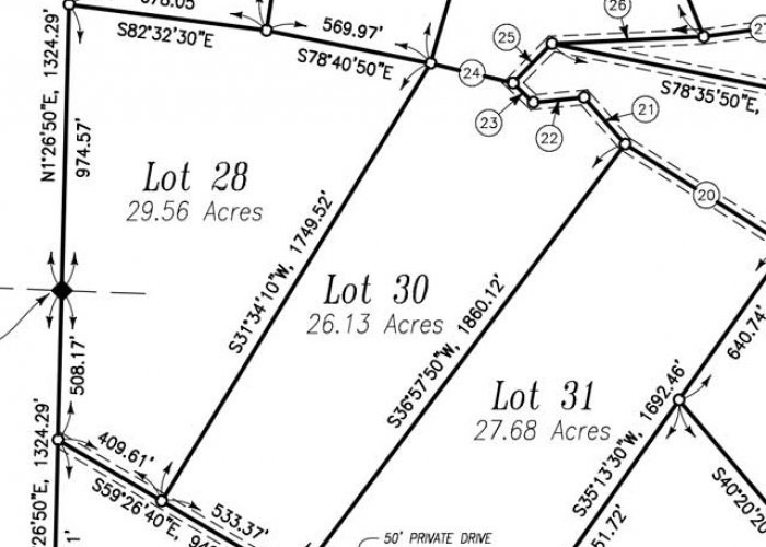 A licensed surveyor will combine research of existing documents with a physical survey of the land in order to create a subdivision plat. The completed plat shows the divisions of the larger piece of land, as well as the distance and bearings between each corner of land.